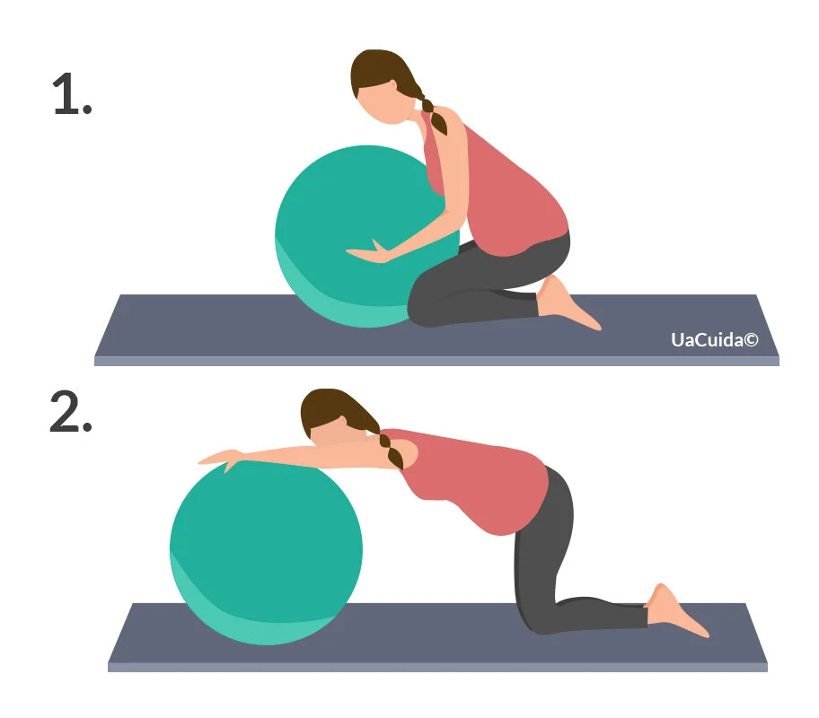 Mantendo as costas direitas, empurrar a bola lentamente, de maneira a ficar com os braços esticados e alongar os músculos das costas.