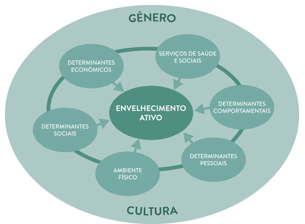 De acordo com a Organização Mundial de Saúde (2003, p. 19) o envelhecimento ativo está relacionado com um conjunto de fatores/determinantes, de ordem pessoal, comportamental, social, económicos, ambiente físico, serviços sociais e de saúde.